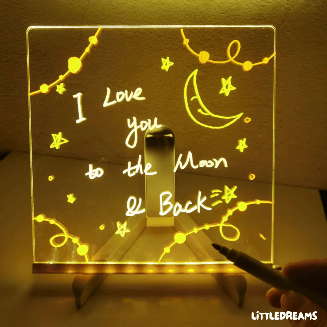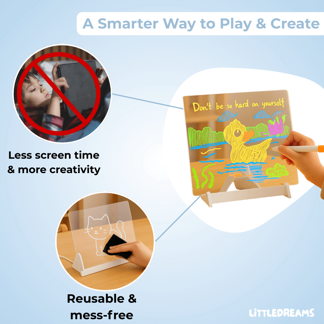 Struggling with too much screen time or finding ways to calm your child before bed? Our DreamBoard turns playtime into a magical, screen-free experience. With its glowing LED surface, children can draw, write and practise endlessly, while the gentle light creates a soothing bedtime atmosphere. Reusable, mess-free and endlessly fun – the DreamBoard is every parent’s new bedtime ally.